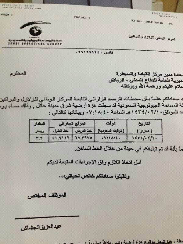 هزة ارضيه على بعد 23 كيلو تضرب جنوب منطقة حائل بلغت 3.2 درجة على مقياس ريختر وعلى عمق 11 كيلو حيث تشير الاخبار انهم سمعوا دوي انفجار قوي وشعروا بالهزة الارضيه موقع الهزه الارضيه بعد التأكد هي وقعت بأحد الجبال الواقعه بجنوب حائل وبقربها وعلى ومسافة 3 كيلو محطة وقود https://pbs.twimg.com/media/A-0b7UZCEAAxd14.jpg:large |
