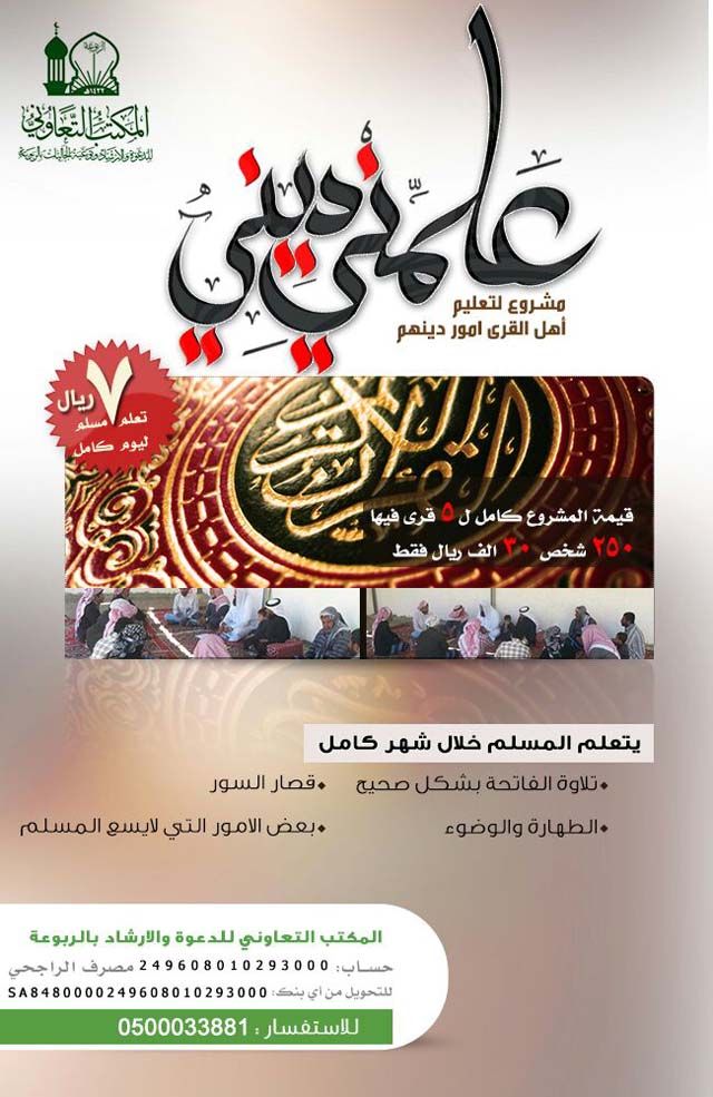بسم الله الرحمن الرحيم قال رسول الله صلى الله عليهـ وسلم ( إن الله وملائكته وأهل السموات والأرض حتى النمل في جحرها وحتى الحوت في جوف البحر ليصلون على معلم الناس الخير ) علمني ديني مشروع لتعليم أهل القرى امور دينهم المشروع تابع للمكتب التعاوني للدعوة والإرشاد وتوعية الجاليات بالربوعة يتعلم المسلم خلال شهر كامل : - تلاوة الفاتحة بشكل صحيح - قصار السور - الطهارة والوضوء - الصلاة - بعض الامور التي لايسع المسلم جهلها فقط ب 7 ريال تعلم مسلم ليوم كامل قيمة المشروع كامل ل 5 قرى فيها 250 شخص 30 الف ريال فقط وهذا رابط صفحة المشروع في موقع الجاليات للأتصال والإستفسار/ 0500033881 رقم حساب المشروع في بنكـ الراجحي (حساب خاص للجاليات وسيخرج لكـ أسمهم على شاشة الصراف) 249608010293000 وللتبرع من أي بنكـ آخر (رقم الآيبان) sa8480000249608010293000 أنشر الموضوع في المنتديات والايميلات فالدال على الخير كفاعلة فهو مشروع رائع تكون معهم شريكا بالأجر بنسفكـ ونشركـ الموضوع فلا تحرم نفسكـ هذا الخير العظيم |